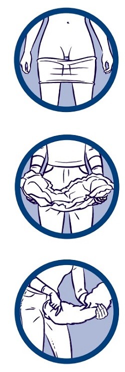 STAAND 1. Trek het fixatiebroekje aan (met de naden naar buiten) en trek het kruis op tot aan de bovenkant van het bovenbeen. Sla de bovenkant van het broekje terug tot halverwege het bovenbeen. 2. Vouw Absorin Sanette open en vouw het product goed dubbel over de lengte zodat er een komvorm ontstaat en de anti-lekrandjes omhoog gaan staan. 3. Trek Absorin Sanette van voor naar achter aan waarbij de grote boog achter hoort. Let op dat Absorin Sanette netjes in het midden zit. 4. Trek eerst de achterkant van het fixatiebroekje omhoog en vouw Absorin Sanette plat over de billen uit, de bovenkant van de absorberende kern hoort net iets boven de bilnaad uit te komen. 5. Haal met een zigzaggende beweging met twee handen de voorkant van Absorin Sanette naar voren zodat het product goed aansluit in de liezen. Vouw de voorkant plat op uw buik, de voorkant van Absorin Sanette zit dan ongeveer halverwege het kruis en de navel. 6. Trek de voorkant van het fixatiebroekje omhoog en zorg ervoor dat het broekje goed aansluit in de liezen. Haal zo nodig met de vingers liesplooien buiten het fixatiebroekje.