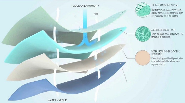 Bovenste laag is een hydrofobe polyester laag die ervoor zorgt dat de vloeistof er snel doorheen kan en zich er niet aan zal hechten. Dit zorgt ervoor dat het oppervlak droog blijft. De tweede laag is de absorberende laag. De derde laag,de onderlaag, is geruwd waardoor het product minder gaat schuiven, ook is deze niet doorlatend maar toch ademend.